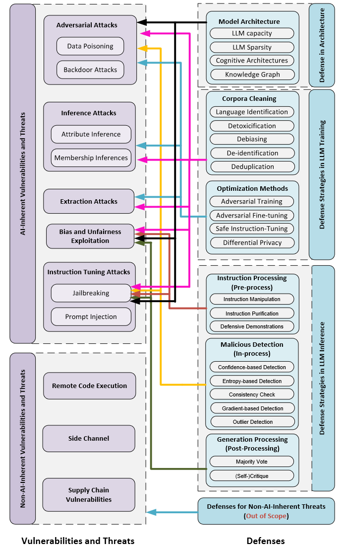 基于模型架构的防御:模型架构决定了知识和概念是如何存储、组织和上下文交互的,这对于大型语言模型的安全性至关重要。研究表明使用较大参数的模型可以更好的以差分隐私的形式进行训练。也有研究表明可以将多种认知架构融入LLM来提高人工智能的鲁棒性。同时也有研究者利用知识图谱增强LLM的推理能力,从而建立对AI的信任关系。